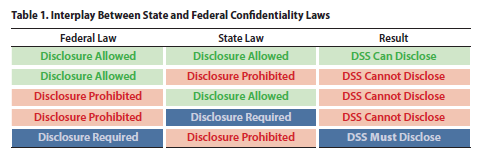 When evaluating this type of conflict between legal requirements, there is a clear distinction between a disclosure that is required under federal law versus state law. If a DSS is prohibited from disclosing information under federal law, DSS should not disclose such information, even if the disclosure would be required under state law. Conversely, if a DSS is allowed to disclose information under federal law but is prohibited from disclosing such information under state law, the DSS should not disclose such information, even though it would be permitted under federal law. However, if federal law requires—not simply allows—disclosure, the information should be disclosed, even if there is a state law prohibiting disclosure. A graphic showing how these laws interact is below.