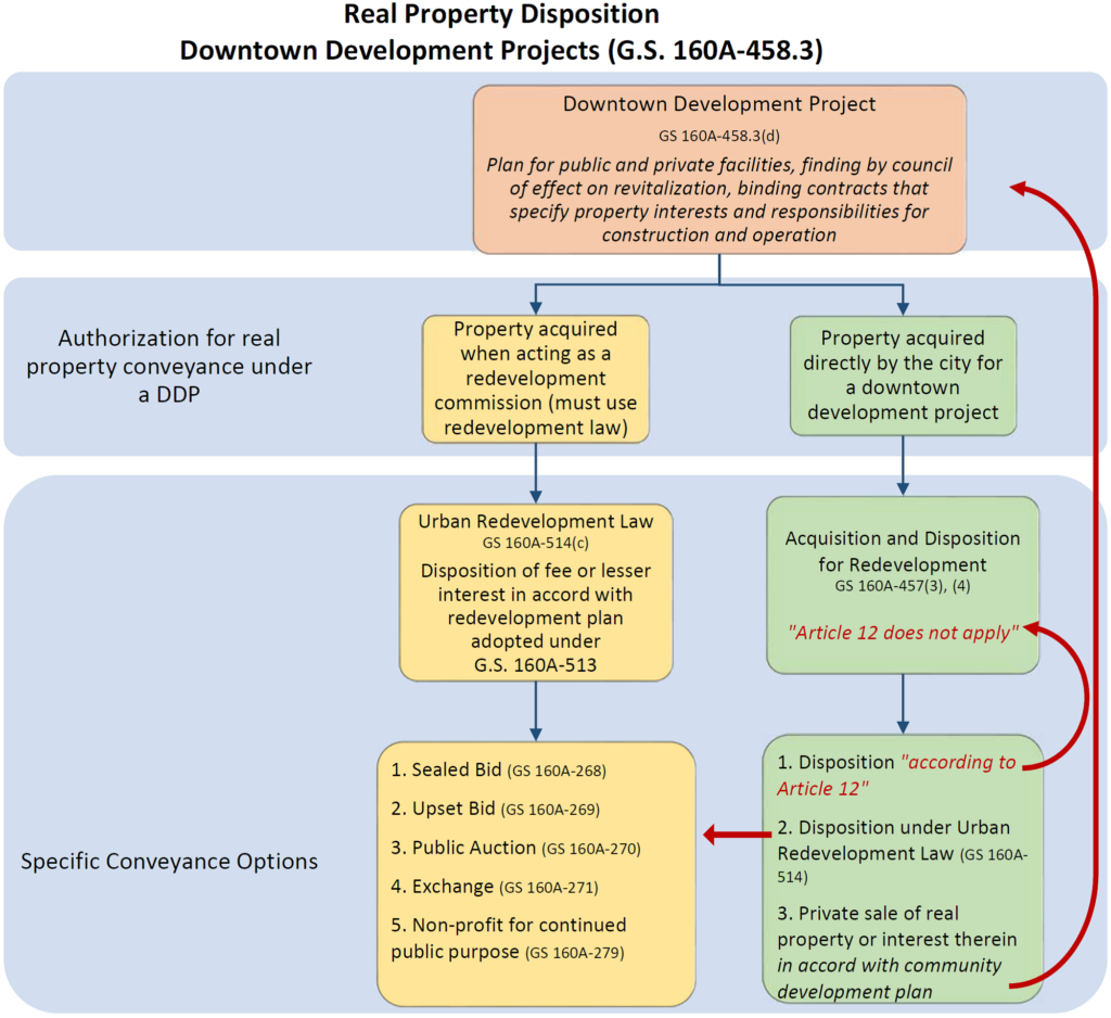 • In 1987, the DDP statute was enacted. All of the above disposition powers were authorized “[i]n connection with a downtown development project.” Property acquired under the Urban Redevelopment Law still had to be disposed pursuant to that law’s procedures. For other property acquired by a city, the use of G.S. 160A-457 disposition procedures was authorized but “Article 12 … does not apply to such dispositions.”