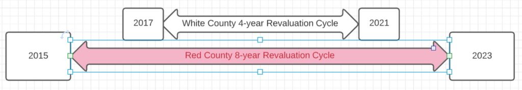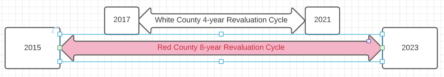 Pretend that Wolfpackville is in both Red County and White County. Red County is on an 8-year revaluation cycle, with revaluations in 2015 and 2023. White County is on a 4-year revaluation cycle, with revaluations in 2017 and 2021.