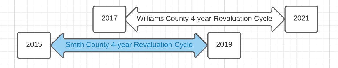 Assume that Tar Heel Town lies in 2 counties, Williams County and Smith County. Williams County is on a 4-year revaluation cycle, with revaluations in 2017 and 2021. Smith County is on a different 4-year cycle with revaluations in 2015 and 2019.
