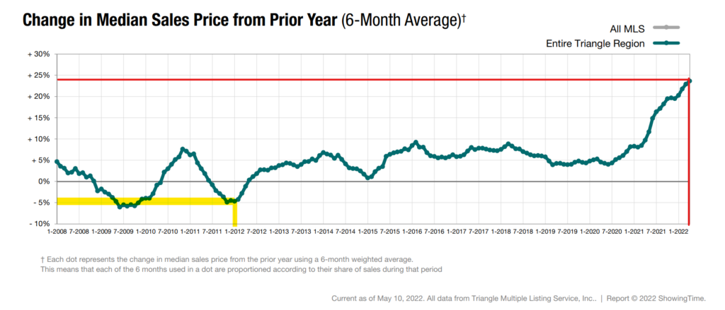 The chart above shows the change in the median home sales price in the Raleigh/Durham/Chapel Hill region for the past 14 years. I added the red lines to show where we are today (nearly 25% increase over prior year’s sales prices) and the yellow lines show where we were in 2012 (5% decrease). Back in 2012, the Triangle experienced two years of larger and larger price decreases. Today, the Triangle is in the midst of two years of larger and larger price increases with no sign of a slowdown.
