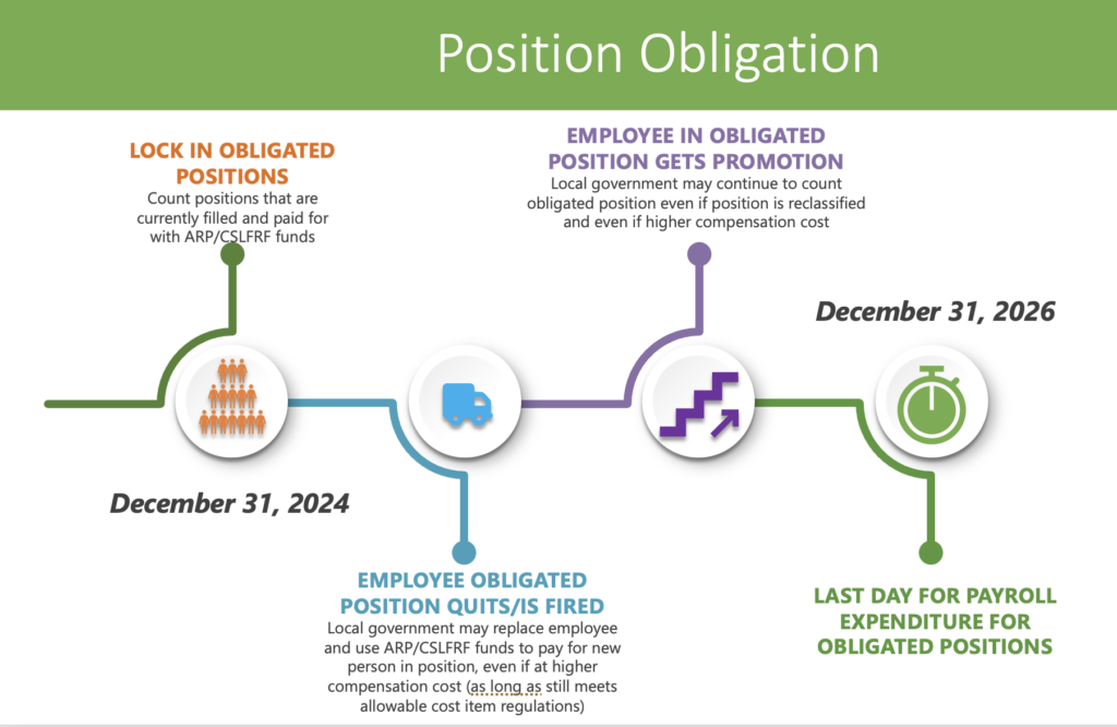 US Treasury is allowing a local government to lock in eligible positions on December 31, 2024, for the remainder of the grant term. That means that a local government may use ARP/CSLFRF funds to pay the salaries and benefits of individuals in those positions, even if the persons occupying the positions change and even if the nature of the positions change (for example if someone in an obligated position receives a promotion). A local unit may lock in position obligations only if ALL the following criteria are met: