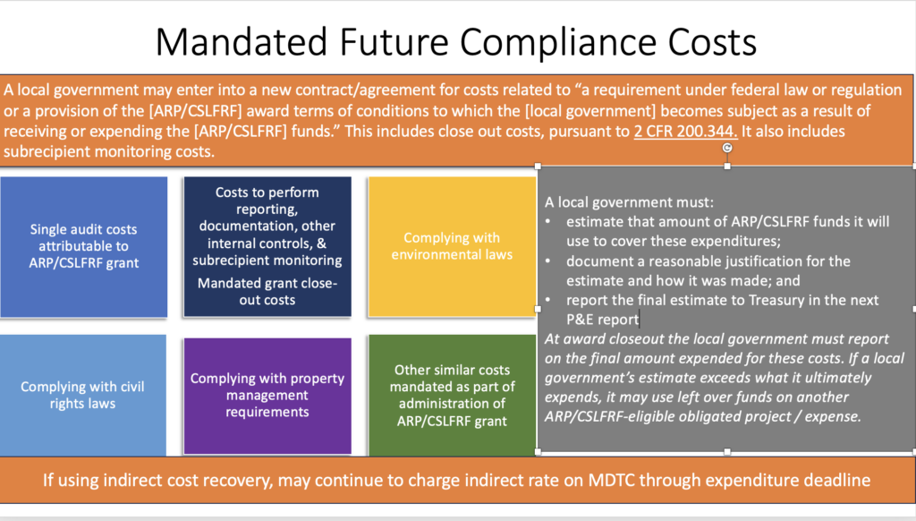 MANDATED FUTURE GRANT COMPLIANCE COSTS OBLIGATION: A local government may hold some ARP/CSLFRF funds back to cover future mandated compliance costs. It may enter into a new contract/agreement for costs related to “a requirement under federal law or regulation or a provision of the [ARP/CSLFRF] award terms of conditions to which the [local government] becomes subject as a result of receiving or expending the [ARP/CSLFRF] funds” after December 31, 2024. These costs include personnel costs to manage the grant (e.g., reporting, documentation, internal controls, subrecipient monitoring) between January 1, 2025 and December 31, 2026. They also include audit costs attributable to the ARP/CSLFRF grant and mandated close-out costs. Additionally, if a local government chose the indirect cost allocation method, it may continue to apply the indirect cost recovery formula to its ARP/CSLFRF projects through the end of the grant term..