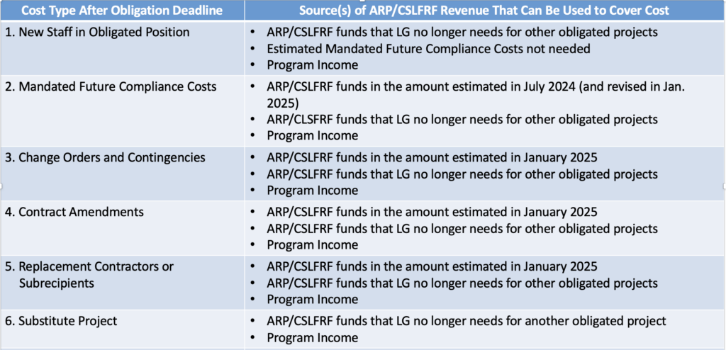 The following chart summarizes the types of new or increased costs that may be covered with excess ARP/CSLFRF funds after the obligation deadline. (LG stands for local government.)