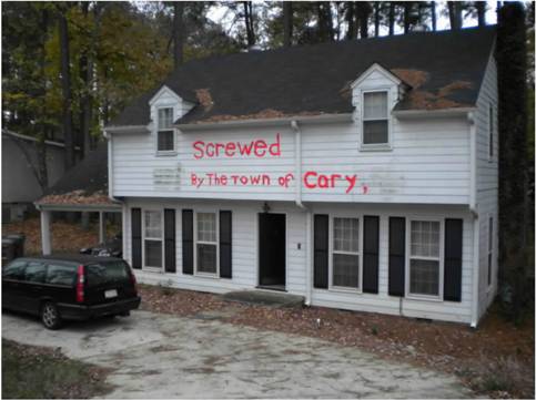 The case of Bowden v. Town of Cary, 754 F. Supp. 2d 794 (2010), appeal filed, No. 11 – 1480 (4th Cir. May 6, 2011), involved a dispute between a property owner and the town in which the property owner claimed that water runoff from a town street had caused major damage to his house. When the problem was not resolved, Bowden painted a protest sign occupying about 48 square feet on the front of his white house. The sign, in large fluorescent orange and pink letters, read: “Screwed by the Town of Cary.” Remarkably enough, Cary’s development ordinance included comprehensive provisions devoted to the kinds of signs that could be displayed in residential zoning districts. Although “political signs” were authorized in residential districts, those signs along with various other types of signs could not exceed 720 square inches in area or 42 inches in height. The regulations were obviously oriented to campaign or election signs rather than to more full-blown political statements.